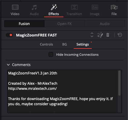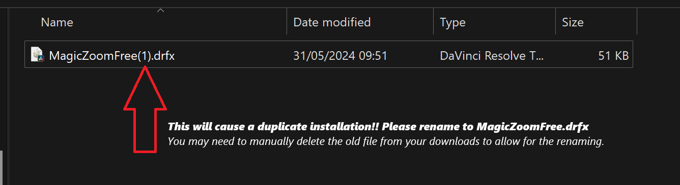 Note: Please ensure the downloaded file is called MagicZoomFree.drfx before updating. IT MUST be called MagicZoomFree.drfx. If it's called MagicZoomFree(1).drfx (due to already having a copy in your downloads folder etc) then this will cause duplicate installations within Davinci Resolve.